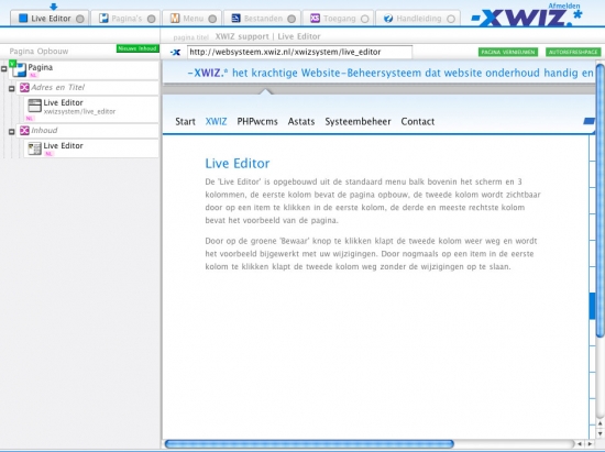 De 'Live Editor' is opgebouwd uit de standaard menu balk bovenin het scherm en 3 kolommen, de eerste kolom bevat de pagina opbouw, de tweede kolom wordt zichtbaar door op een item te klikken in de eerste kolom, de derde en meeste rechtste kolom bevat het voorbeeld van de pagina.
