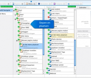 Het menu bestaat uit een boomstructuur die u kunt sorteren door items met de muis te slepen. Een pagina kunt u koppelen aan een menu item door deze er bovenop te slepen in het tabblad 'Menu'.