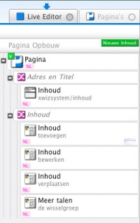 Aan een pagina kan inhoud toegevoegd worden, zoals een paragraaf voor tekst, een collectie afbeeldingen, een e-mail formulier, een koppeling naar een andere site en zoekwoorden voor de zoekmachines. Met de knop 'Nieuwe inhoud' kunt u een keuze maken tussen de verschillende inhoudsitems.
